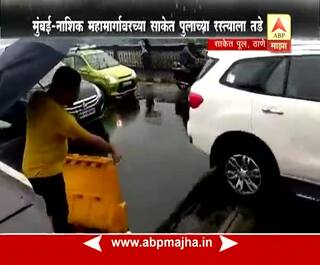 सततच्या मुसळधार पावसामुळे ठाण्याच्या साकेत पुलावर रस्त्याला तडे गेलेत. त्यामुळे वाहतूक पोलिसांनी ठाण्याकडे येणारी अवजड वाहनांची वाहतूक अन्य मार्गाने वळवली आहे. मुंबई - नाशिक महामार्गावर ठाण्याच्या खाडीवर साकेत पूल आहे. या पुलावर नाशिकहून मुंबईकडे येणाऱ्या मार्गिकेवर दोन गर्डरच्या मधोमध रस्त्याचा काही भाग काल मध्यरात्रीच्या सुमारास खचला आणि संपूर्ण रस्त्याला मोठा तडा गेला. या तड्यामुळे पुलाला काहीही धोका नसला, तरी अवजड वाहनांमुळे रस्ता ढासळण्याची भीती आहे. त्यामुळे या खचलेल्या भागावरून होणारी अवजड वाहनांची वाहतूक पोलिसांनी अन्य मार्गाने वळवली आहे. तर रस्त्यावर काही भागात बॅरिकेड्स लावण्यात आल्यामुळे इतर वाहनांचाही वेग मंदावला आहे.